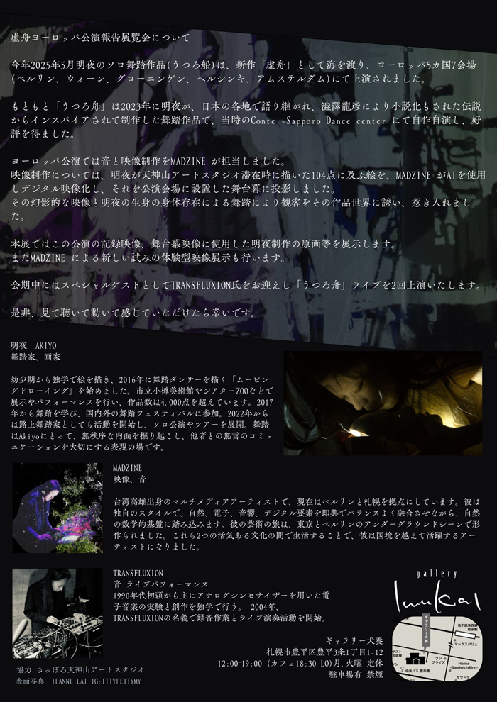 2025年10月25日(土) 11月1日(土)うつろ舟舞踏・映像・音ライブ会場ギャラリー犬養 豊平区豊平3条1丁目1-12開演19:30料金¥3000出演舞踏 明夜 音 TRANSFLUXION 映像 MADZINE